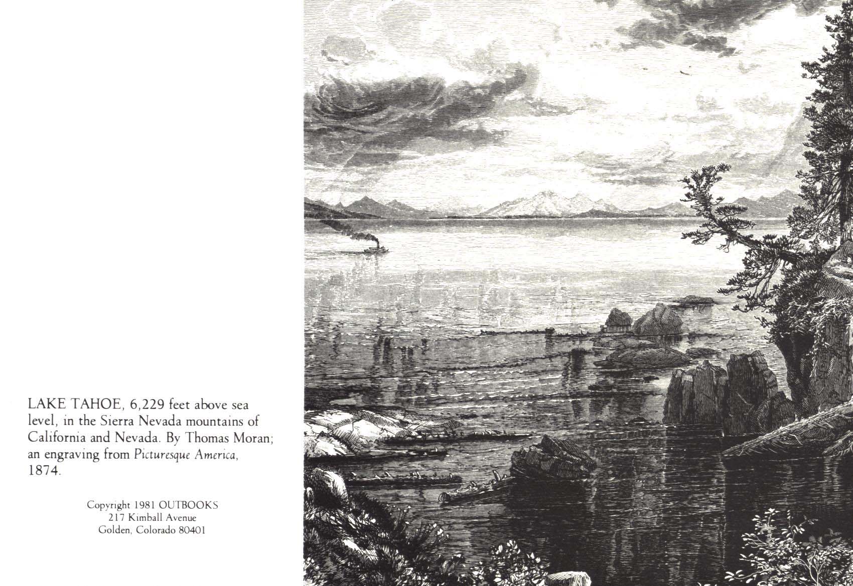 LAKE TAHOE, 6,229 feet above sea level, in he Siera Nevada mountains of California and Nevada. by Thomas Moran; an engraving from Picturesque America, 1874.